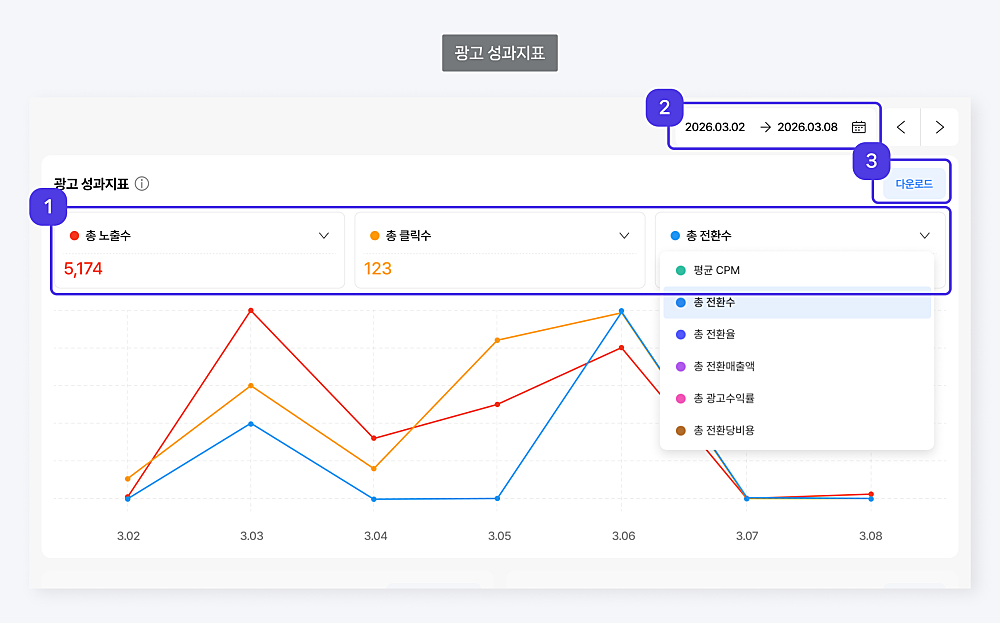 – 원하는 성과 지표를 설정하거나, 캠페인 성과를 다운로드할 수 있습니다.