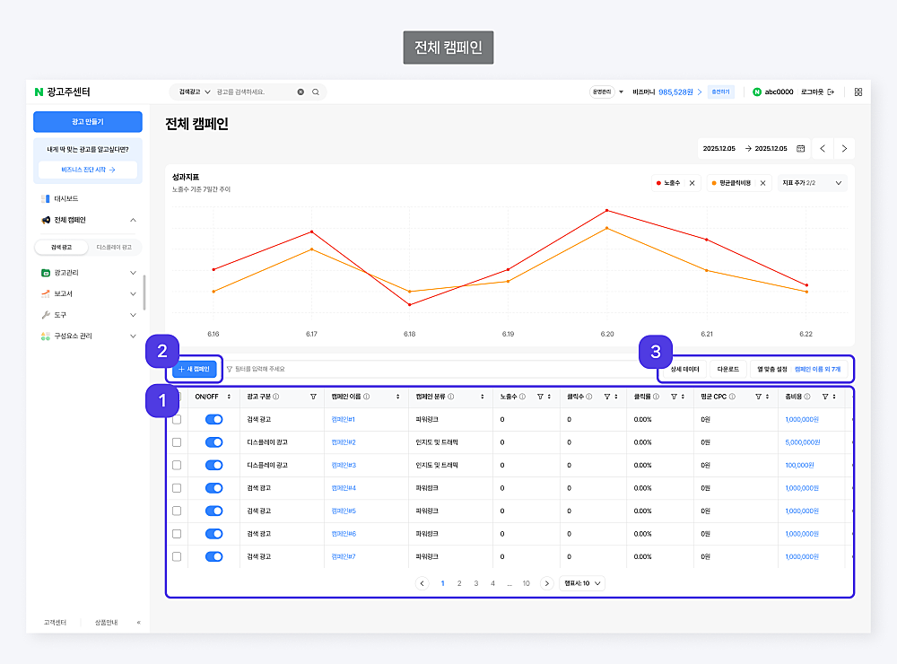– 다운로드 : 등록된 전체 캠페인 리스트를 성과 지표와 함께 다운로드합니다.