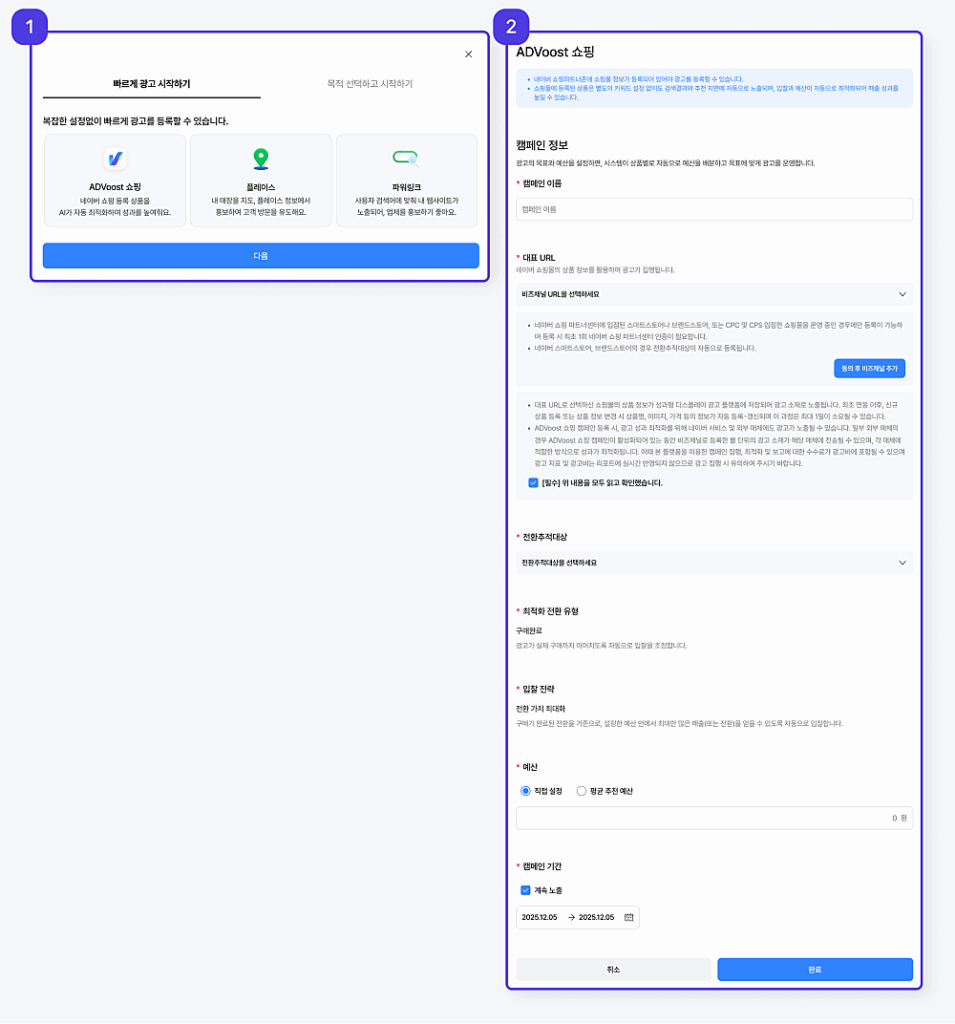 – 광고 집행을 위한 필수 정보만 입력하면 ADVoost 쇼핑, 플레이스, 파워링크 캠페인을 바로 시작할 수 있습니다.