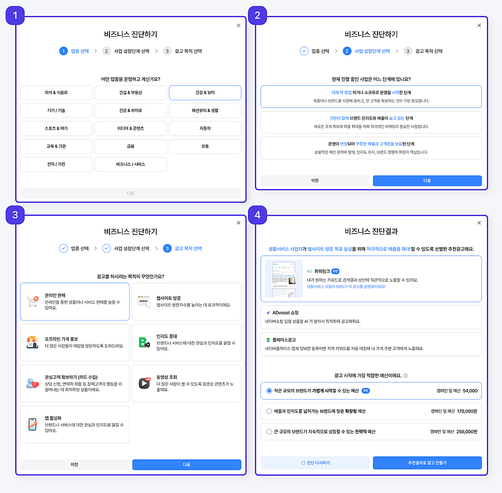– 선택한 업종, 성장 단계, 광고 목적에 따라 가장 적합한 광고 상품을 추천해 드립니다.
